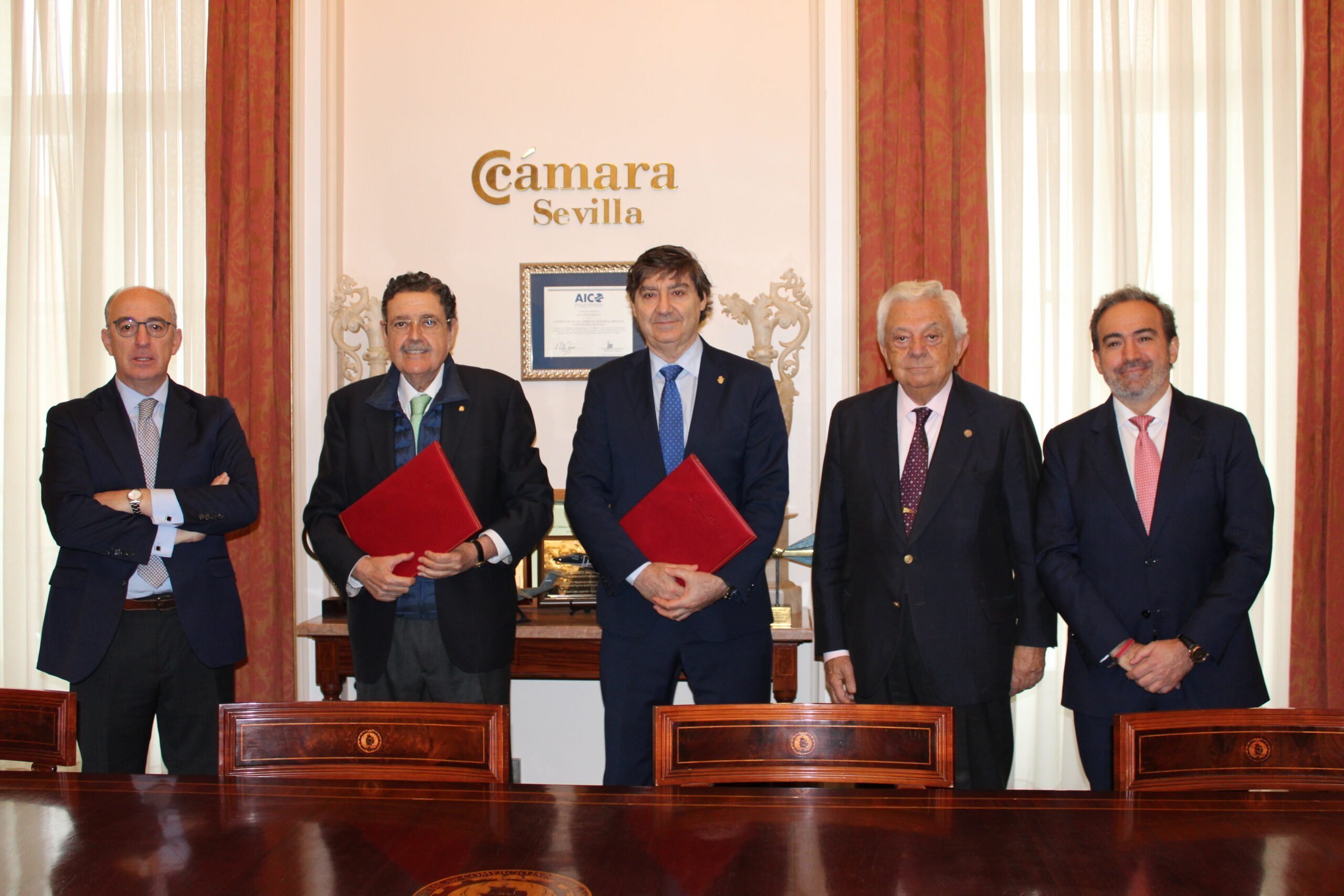 Al acto de la firma del Convenio de Colaboración han asistido José Alberto Parejo Gámir (Rector Magnífico de la Universidad), Javier María Tello Bellosillo (Director General de la Universidad), Óscar Fernández León (Decano del Ilustre Colegio de Abogados de Sevilla y Presidente de la Corte), Francisco Herrero León (Presidente de la Cámara y Vicepresidente de la Corte) y Pablo Gutiérrez de Cabiedes (Decano de la Facultad de Ciencias Empresariales y Jurídicas).