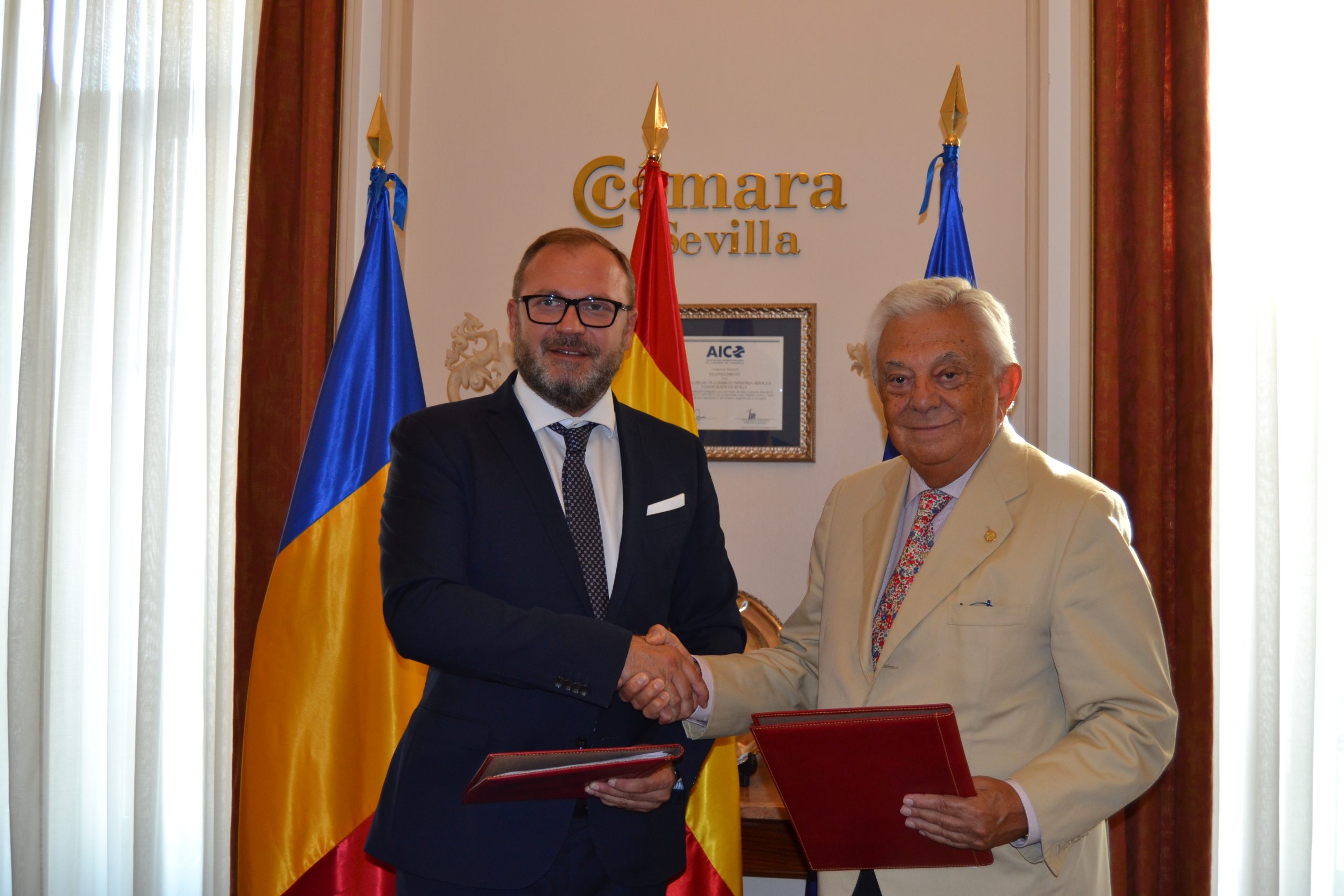 El presidente de la Cámara, Francisco Herrero y el cónsul general de Rumanía en Sevilla, Bodgan Stanescu, firman un acuerdo de colaboración para apoyar a las personas, emprendedores y empresas de Rumanía, asentadas en Sevilla o que desarrollan su actividad en la provincia para que conozcan y participen en los programas y servicios de la Cámara de Comercio.