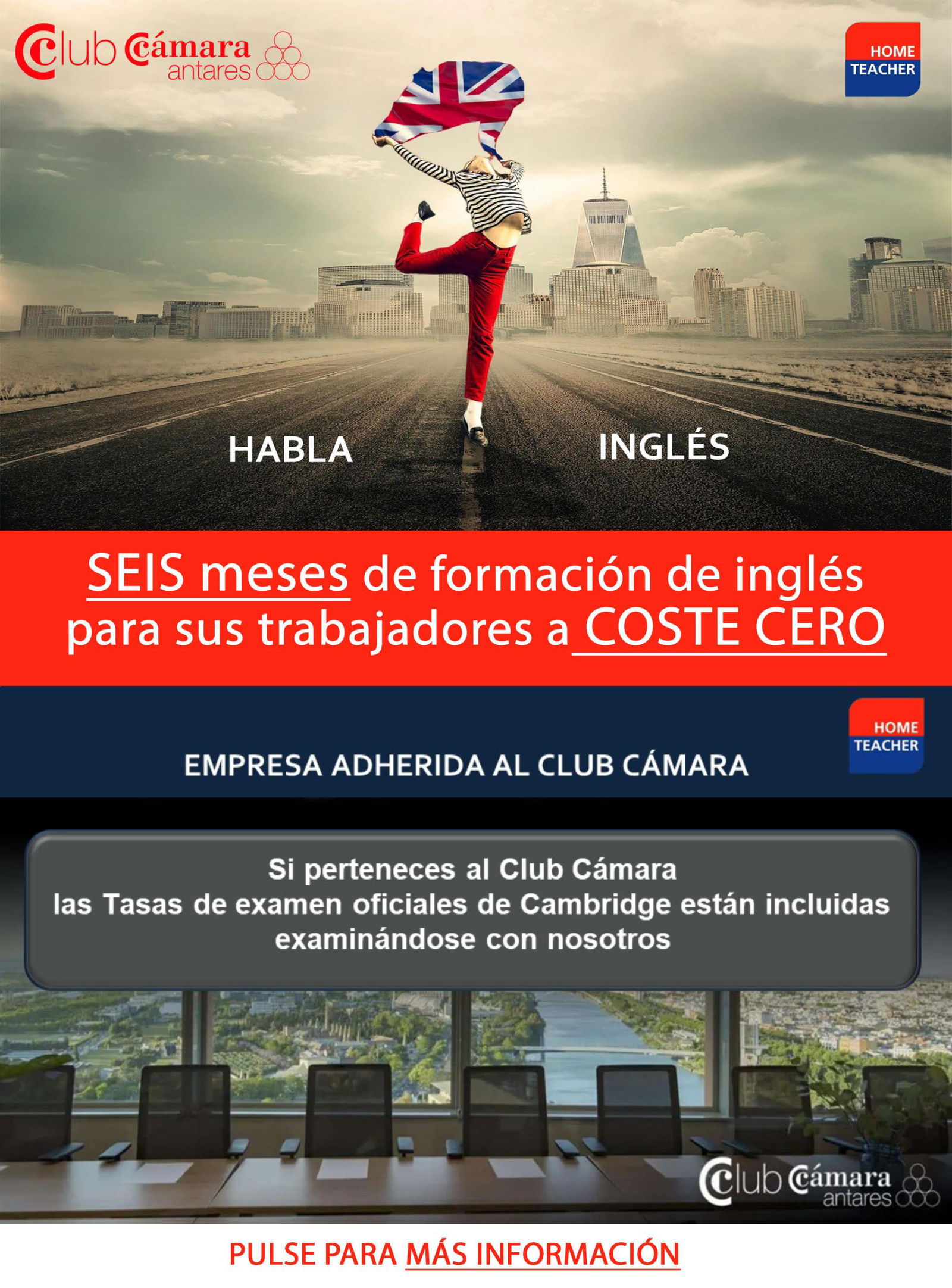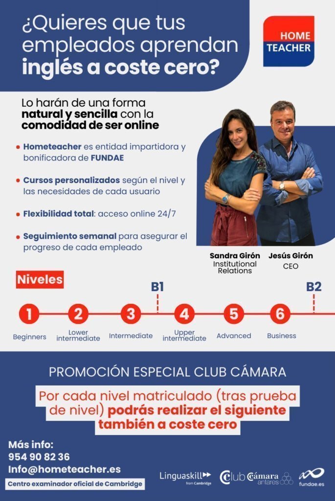 En esta ocasión, HOMETEACHER, está ofreciendo a las empresas formación de inglés para sus trabajadores a COSTE CERO a través de Fundae, dando TRES meses para formarse en inglés en el nivel que el alumno necesite. Para los socios del Club Cámara ofrece en lugar de tres meses, SEIS meses y que el alumno aprenda dicho nivel y siga avanzando durante tres meses más adquiriendo de esta forma más conocimientos. Cuando el alumno haya alcanzado un nivel B1 o B2 tendrá derecho a preparación y examen sin tener que abonar las tasas que ascienden a 120 euros más 20 del reconocedor facial ya que por ser del Club Cámara quedan absorbidas.
