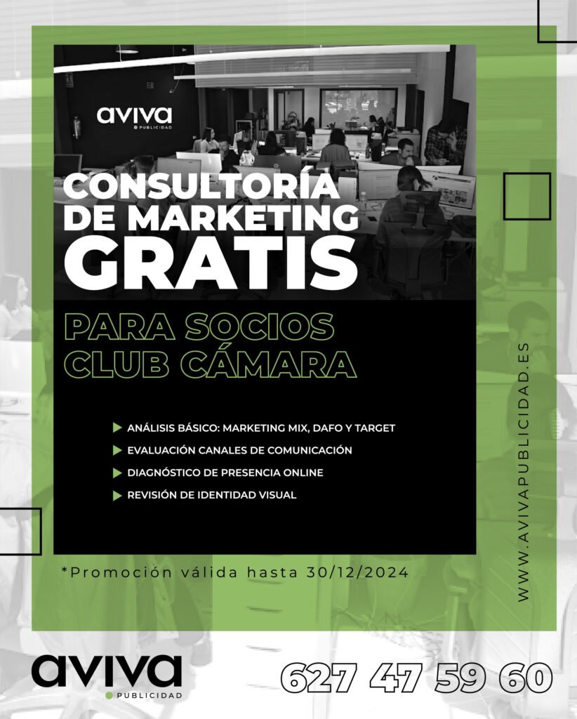 Oferta exclusiva se enmarca dentro de las VENTAJAS PARA TERCEROS, que consisten en que la empresa adherida al Club Cámara pueda ofrecer alguna consideración ventajosa al resto de socios del Club, relativa a compra, uso o disfrute de sus productos o servicios. Viene incluido en nuestro catálogo de Servicios y definido en el documento Acuerdo de Nivel de Servicio. En Aviva Publicidad quieren hacer destacar vuestra empresa en 2025 con una estrategia ganadora y para ello os ofrecen una ASESORÍA DE MARKETING GRATUITA | |