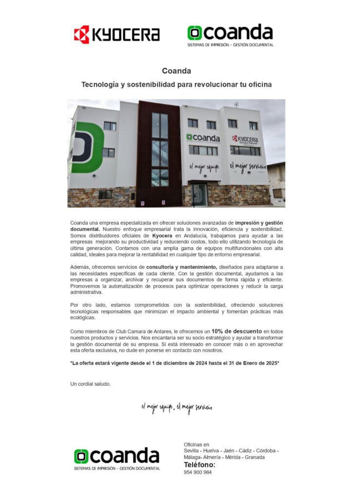 En COANDA-KYOCERA, empresa especializada en ofrecer soluciones avanzadas de impresión y gestión documental, quieren ofrecer a las empresas del Club Cámara, un 10% de descuento en todos sus productos y servicios para ayudarles a transformar la gestión documental de su empresa.