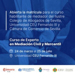 Sevilla, 19 de febrero de 2025.- La Corte de Arbitraje y Mediación de Sevilla (creada por el Colegio de Abogados y la Cámara de Comercio de Sevilla) y la Universidad CEU Fernando III (UF3) impartirán de manera conjunta un Curso de Experto en Mediación Civil y Mercantil. La mediación es uno de los medios adecuados de solución de controversias previstos en la Ley Orgánica 1/2025, de eficiencia del servicio público de Justicia, como requisito de procedibilidad antes de poder acudir a los tribunales de la jurisdicción civil y mercantil.