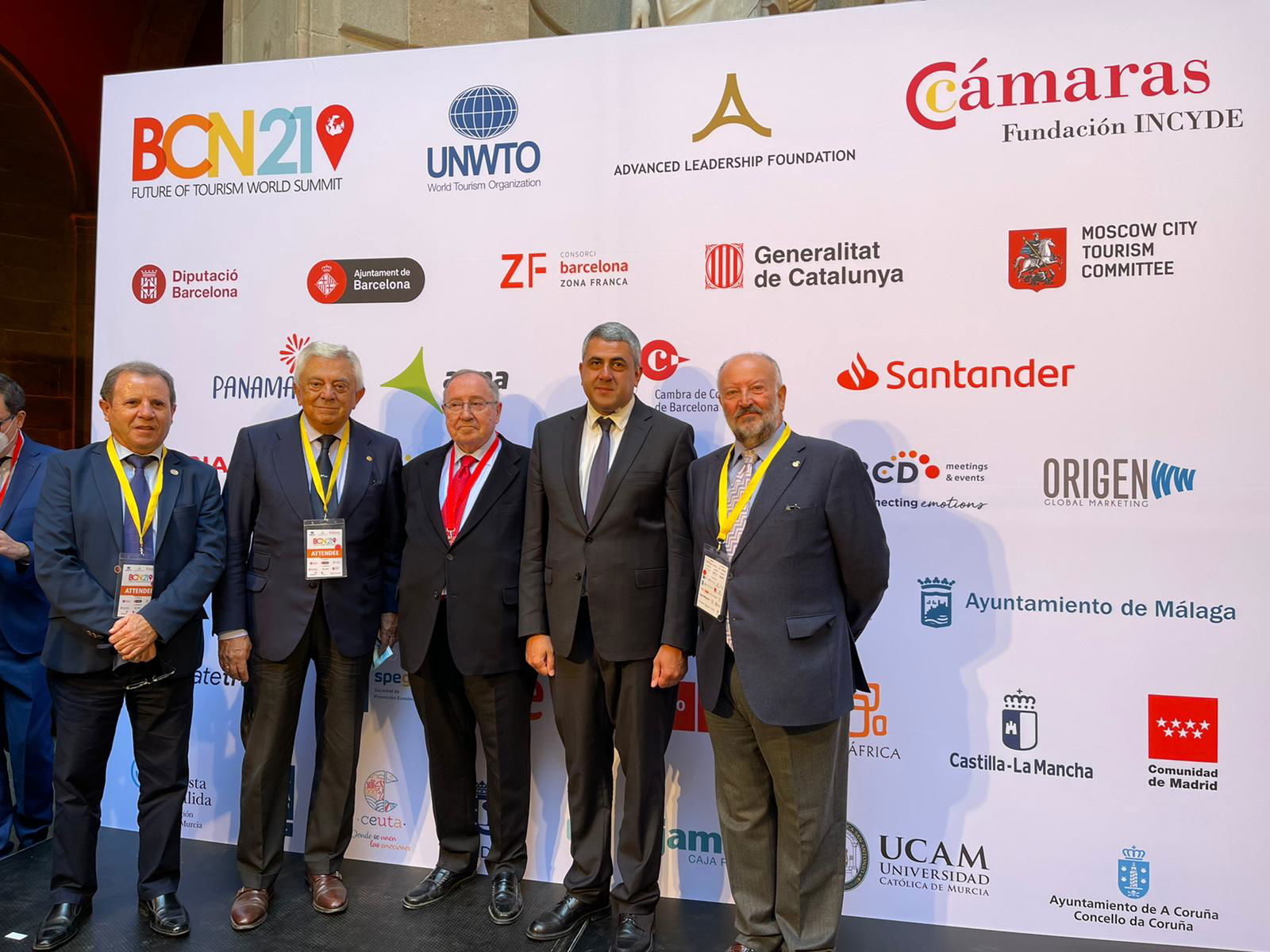 Los presidentes de las Cámaras de España, José Luis Bonet, de Sevilla, Francisco Herrero, de Almería, Jerónimo Parra y el Vicepresidente de la Cámara de Linares, Isaac Chamorro, con el Secretario General de Organización Mundial del Turismo, Zurab Pololikashvili en la Cumbre Mundial “Future of Tourism World Summit” que se celebra en la Llotja de Mar de Barcelona el 26 y 27 de octubre.