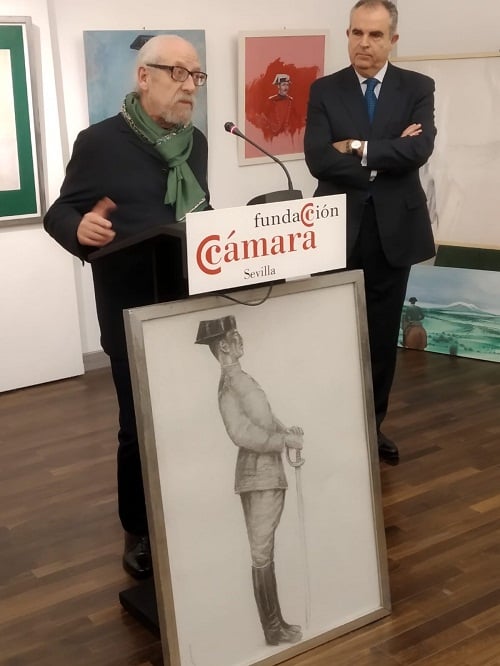 El General Jefe de la IV Zona de la Guardia Civil de Andalucía, Manuel Contreras Santiago y el Presidente de la Cámara de Comercio de Sevilla, Francisco Herrero, junto al autor de las obras, Luiso Orte inauguraron la exposición que estará abierta al público hasta el 1 de marzo.