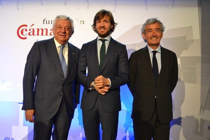 PIE DE FOTO. El Presidente de la Cámara de Comercio, Francisco Herrero, el Presidente de GAT Inversiones Rosauro Varo y el Presidente de Konecta, José María Pacheco, encargado de presentar al conferenciante.