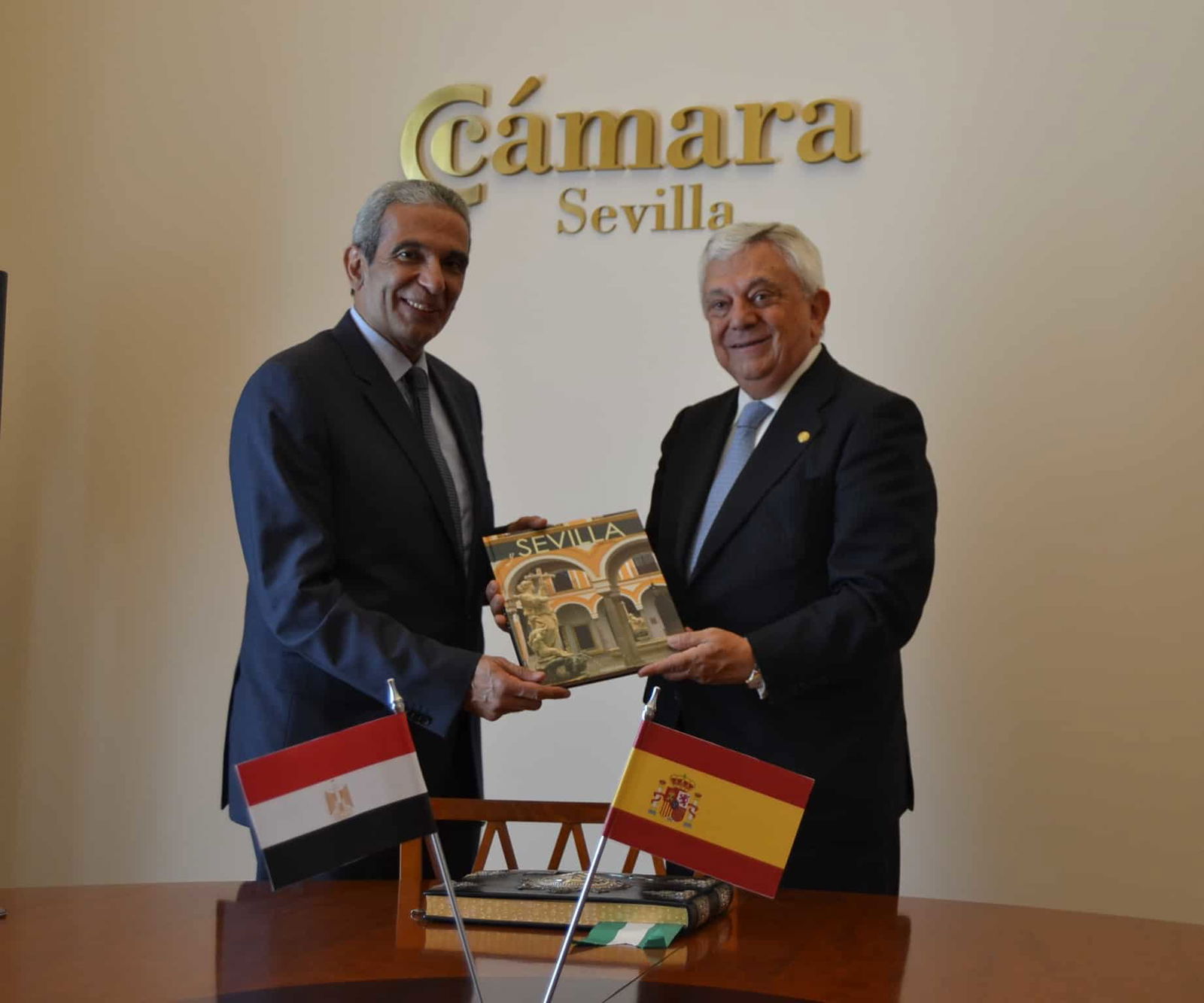 El Embajador de Egipto en España, Ahmed Shafik Ismail Mahmoud Abdelmoeti acude a la Cámara de Comercio para trasladarle a los empresarios sevillanos las oportunidades de negocio que ofrece su país, especialmente en los sectores, aeronáutico, agroalimentario, hortofrutícola, inmobiliario, de construcción, de ingeniería, de fabricación de muebles, de maquinarias y bienes de equipo.