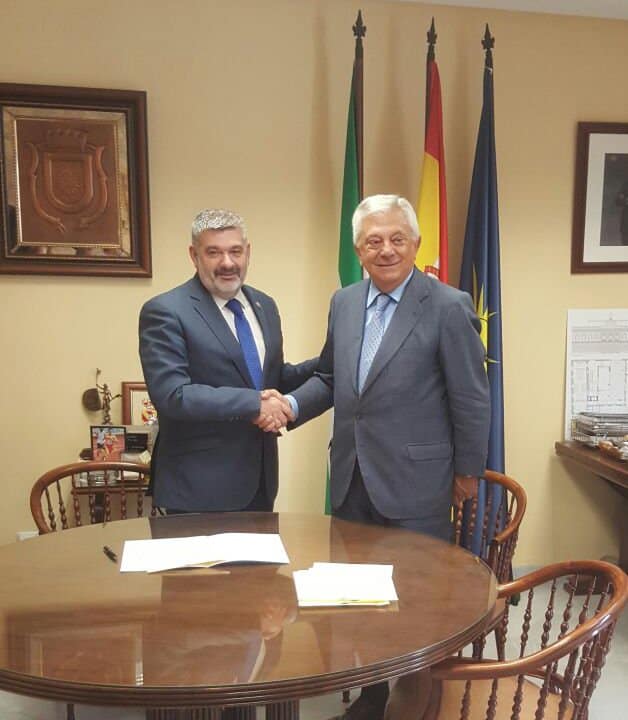 El alcalde de Écija, David García Ostos, y el presidente de la Cámara de Comercio de Sevilla, Francisco Herrero, han firmado esta mañana un nuevo convenio para el mantenimiento en Écija de la oficina de la Cámara de Comercio, antes conocida como Antena Local, la única existente en la provincia de Sevilla.