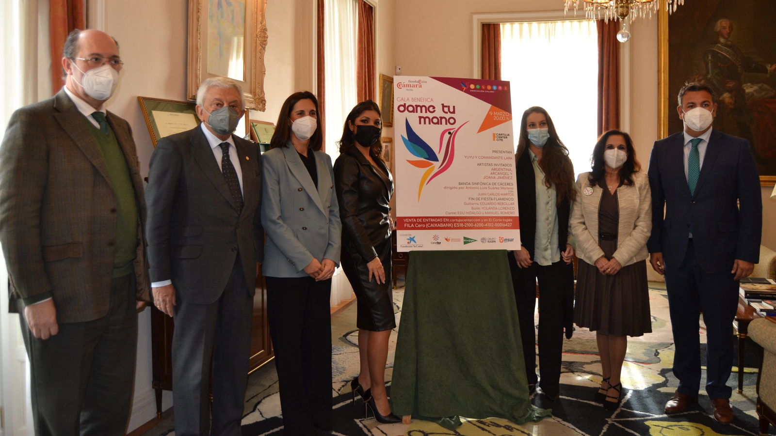 La presentación de la Gala ha contado con la presencia de Francisco Herrero, presidente de la Cámara, de Mamen Martín Salinas, directora de Acción Social de Caixabank en Andalucía Occidental y Extremadura, de María José Ruiz Leal, presidenta de la Asociación Colibrí, de Borja Díaz-Canel, gerente de desarrollo de negocio del Grupo EULEN, y de las artistas, Argentina y Joana Jiménez.