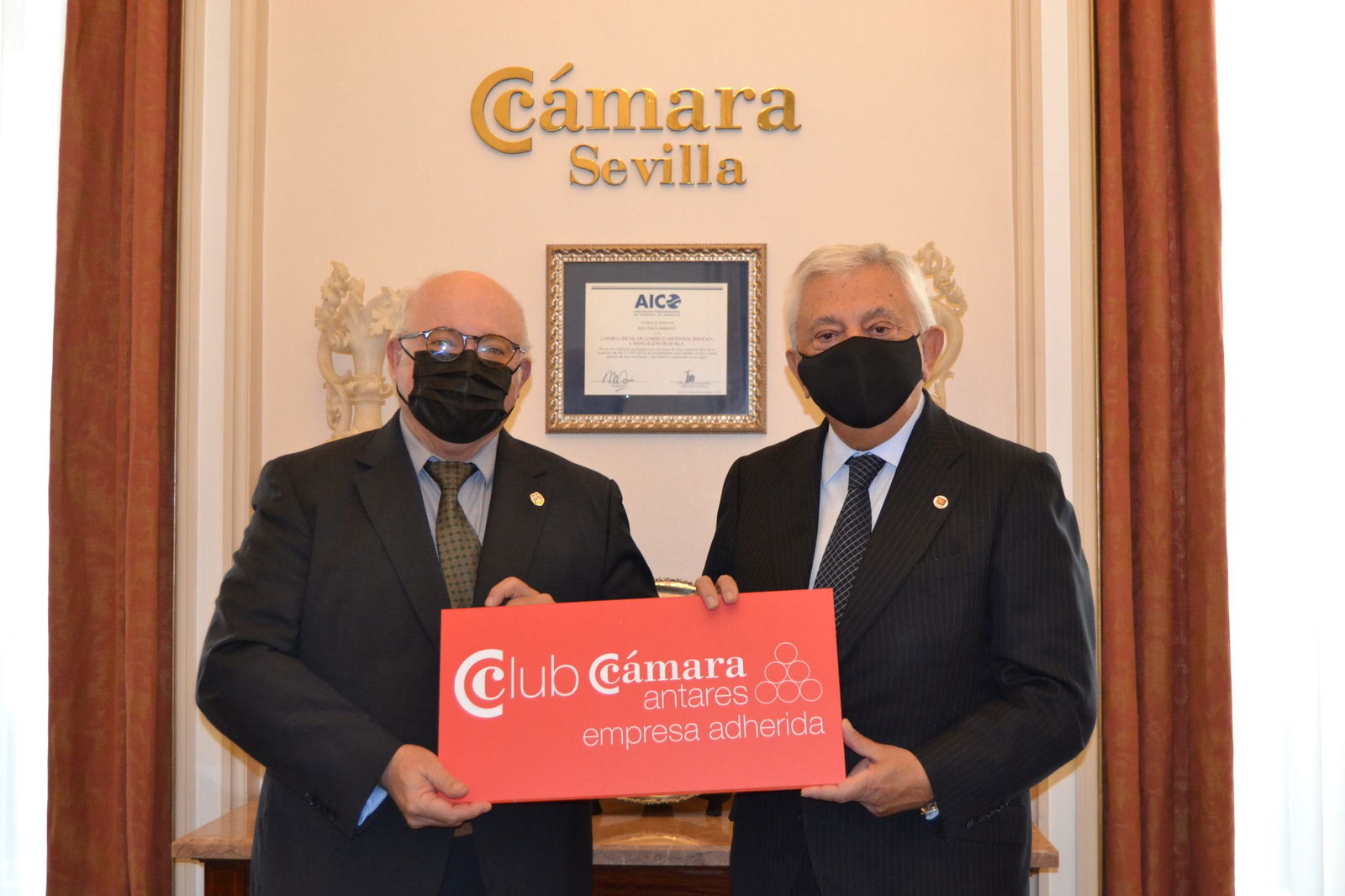 «Se incorpora al Club Cámara Antares en la modalidad de Adherida el CONSEJO REGULADOR DE LAS IGP ACEITUNAS MANZANILLA Y GORDAL DE SEVILLA, Juan Luis Oropesa de Cáceres que es el Presidente, junto a Francisco Herrero, Presidente de la Cámara de Comercio de Sevilla «