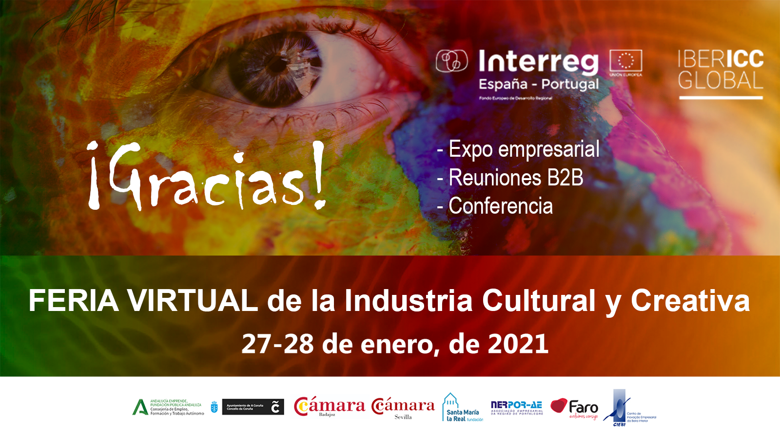 Gracias a ello ha sido posible la celebración de esta Feria Virtual en la que han participado 69 pequeñas y medianas empresas; entidades públicas y privadas, agrupaciones y asociaciones del sector de las Industrias Culturales y Creativas de España y Portugal, que han mostrado su experiencia en subsectores profesionales como el diseño gráfico, publicidad, artes digitales, fotografía, influencers, desarrollo de Apps, realidad virtual, gaming y animación, video, audio y filming, moda, música, danza, teatro, bellas artes, gestión cultural, arquitectura, artesanía, museos y galerías, autores y editores.