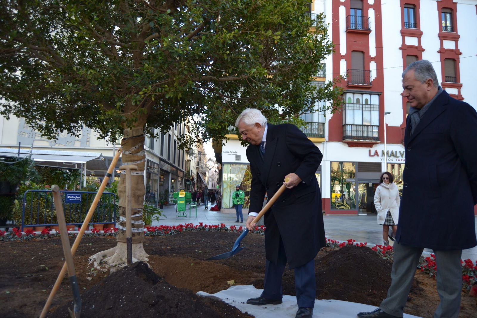 El alcalde de Sevilla, José Luis Sanz, junto al presidente de la Cámara de Comercio, Francisco Herrero, ha protagonizado hoy el acto de la plantación de un Ficus Nitida en la Plaza de la Encarnación. Esta acción se ha llevado a cabo gracias al acuerdo de colaboración con la Fundación Cámara de Comercio.