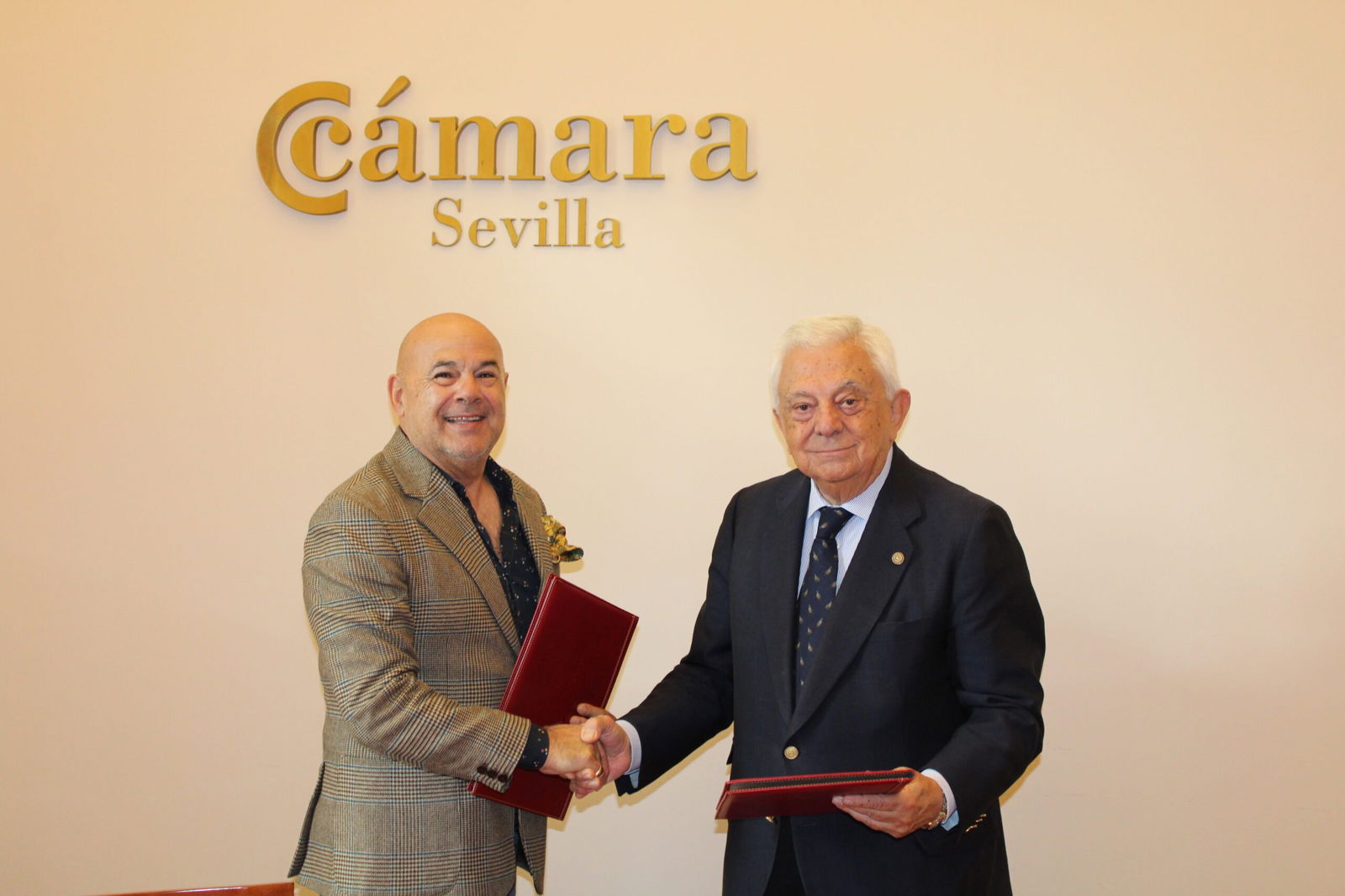 Sevilla, 10 de abril de 2025.- El presidente de la Cámara de Comercio de Sevilla, Francisco Herrero y el presidente de la Asociación Gremial Sevillana de Arte Sacro, Francisco Carrera han suscrito un acuerdo de colaboración para desarrollar acciones que impulsen iniciativas emprendedoras del sector del arte sacro en Sevilla.