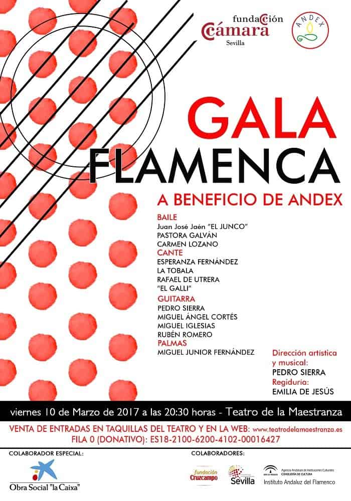 La Gala cuenta con el patrocinio de la Fundación Cruzcampo y CAIXABANK, y con la colaboración del Instituto Andaluz de Flamenco, y el Teatro de la Maestranza.