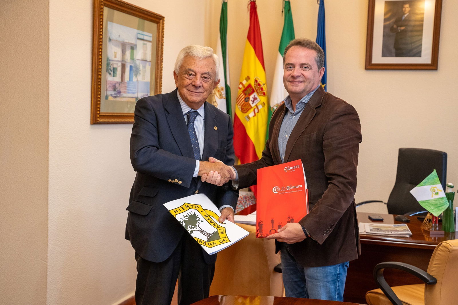 El Ayuntamiento de Mairena del Aljarafe y la Cámara de Comercio de Sevilla han firmado hoy jueves, 14 de noviembre, dos convenios de colaboración que consolidan su compromiso de apoyo a empresas, emprendedores y comerciantes. Antonio Conde, alcalde de Mairena del Aljarafe, y Francisco Herrero, presidente de la Cámara de Comercio, han rubricado este acuerdo para fomentar el crecimiento económico local.