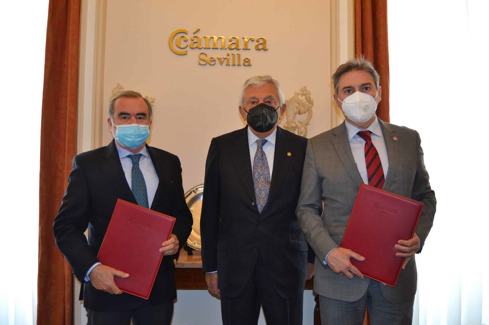 En la imagen, Óscar Cisneros Marco, presidente de ASEMARB y decano del Colegio de Abogados de Sevilla, Franciasco Herrero León, D. Francisco Herrero León, vicepresidente de ASEMARB y presidente de la Cámara de Comercio de Sevilla y José Feria, Presidente del Colegio de Administradores de Fincas de Sevilla
