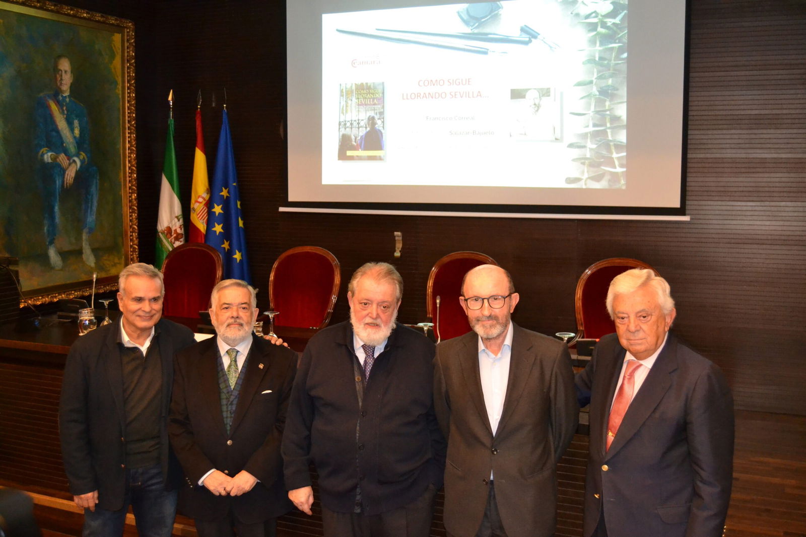 La Fundación Cámara de Sevilla acogió la presentación del nuevo libro del periodista Francisco Correal, medalla de la ciudad de Sevilla, bajo el título ‘Cómo sigue llorando Sevilla’. El periodista Cristóbal Cervantes entrevistó al autor, acto que también contó con la intervención de los fotógrafos sevillanos Fernando Salazar y Ángel Bajuelo, autores de las fotografías de la Semana Santa de Sevilla 2023 que dan color e imagen al libro.
