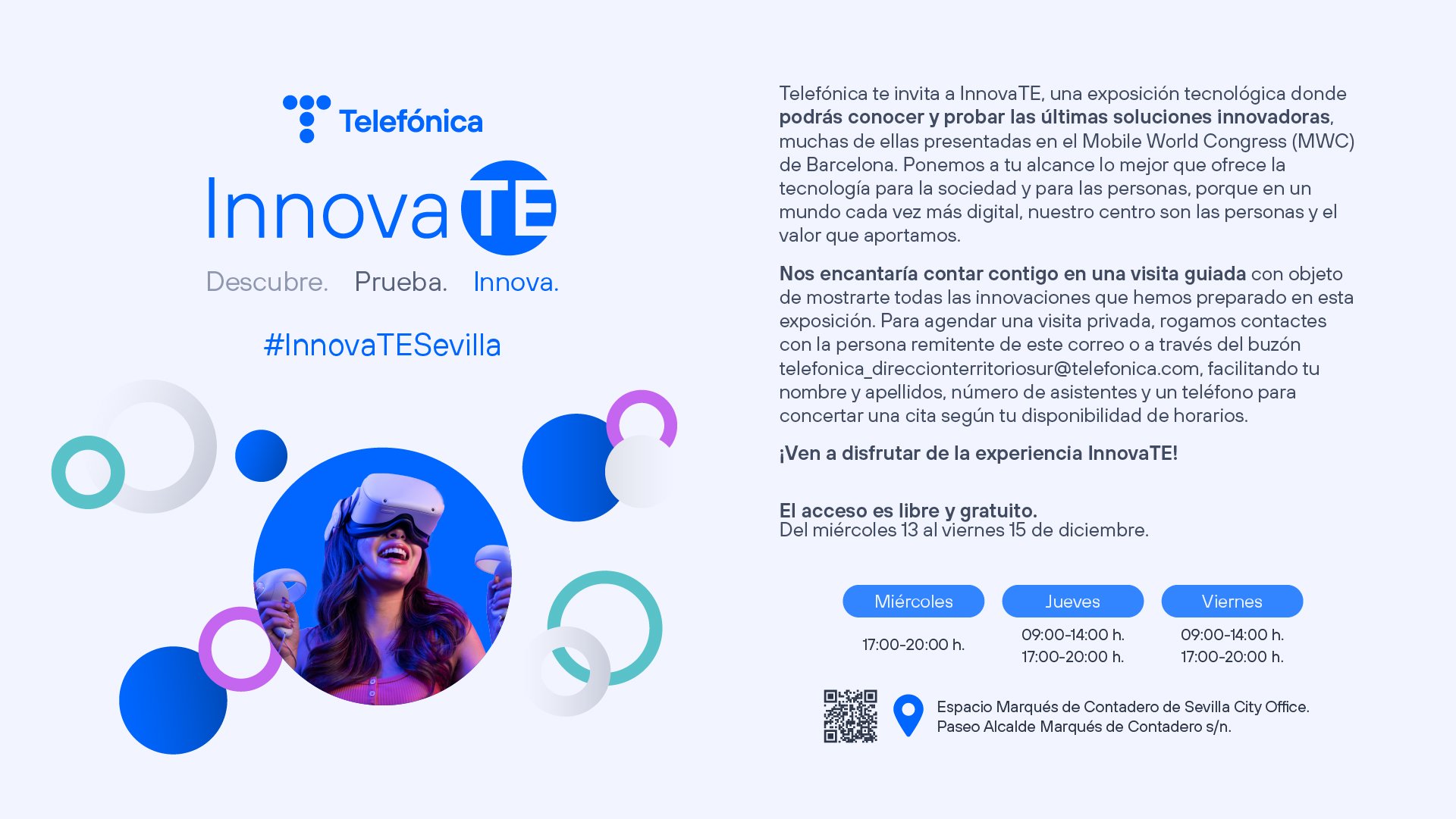 InnovaTe es el escaparate tecnológico e itinerante de Telefónica en España que viaja por algunas de las ciudades de sus Comunidades Autónomas. Esta acción sin fines lucrativos está