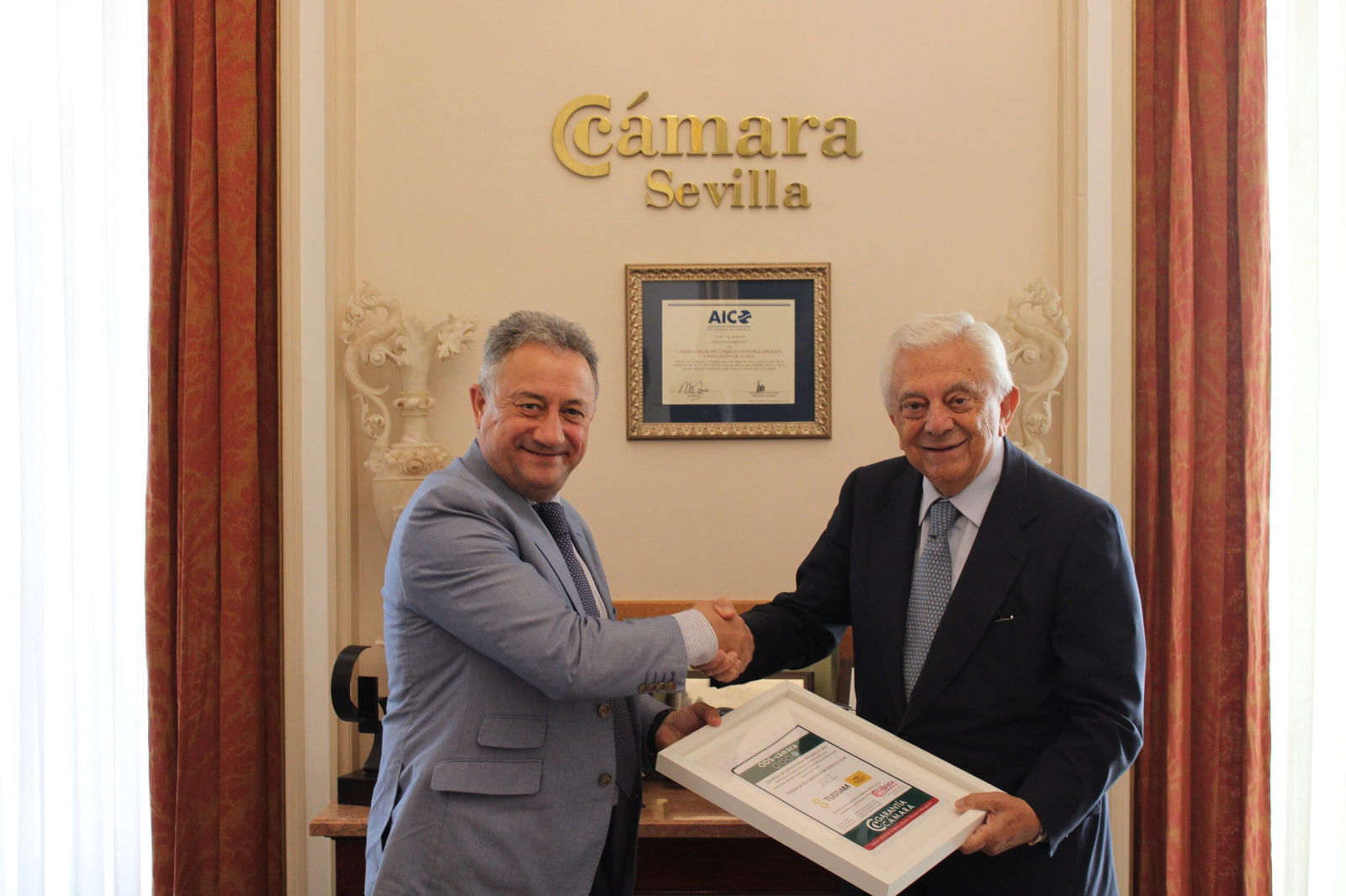 El presidente de la Cámara de Comercio de Sevilla, Francisco Herrero, ha hecho entrega de la certificación ODS-Cámara al director gerente de Tussam, Manuel Torreglosa, quien acudió acompañado por el director de Calidad e I+D+I, Manuel Rosendo, y la jefa del Departamento de Calidad, Estrategia y Sostenibilidad, Carmen Guerrero.