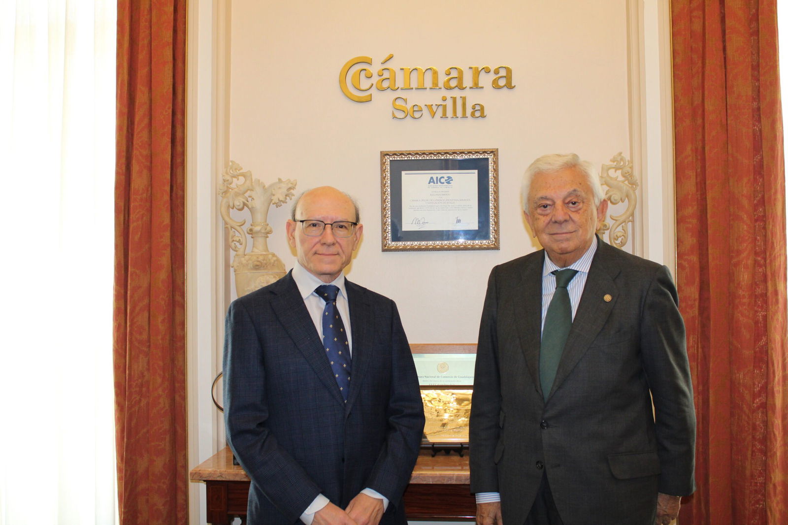 El presidente de la Cámara de Comercio de Sevilla, Francisco Herrero, recibió la visita institucional del hermano mayor de la Hermandad de las Aguas, Narciso Cordero García